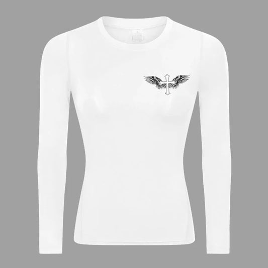 Camiseta de compresión elástica de manga larga Revena™ para mujer con estampado "Cruz Guardián"