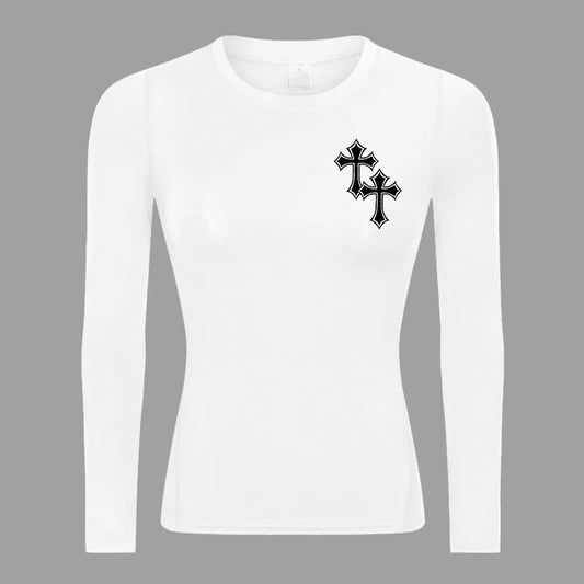Camiseta de compresión elástica de manga larga Revena™ para mujer con estampado "Cruz de Jesús"