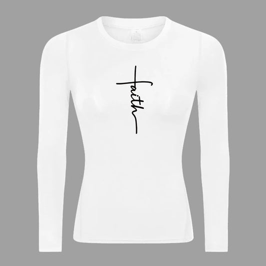 Camiseta de compresión elástica de manga larga Revena™ para mujer con estampado "Cruz de la Fe"