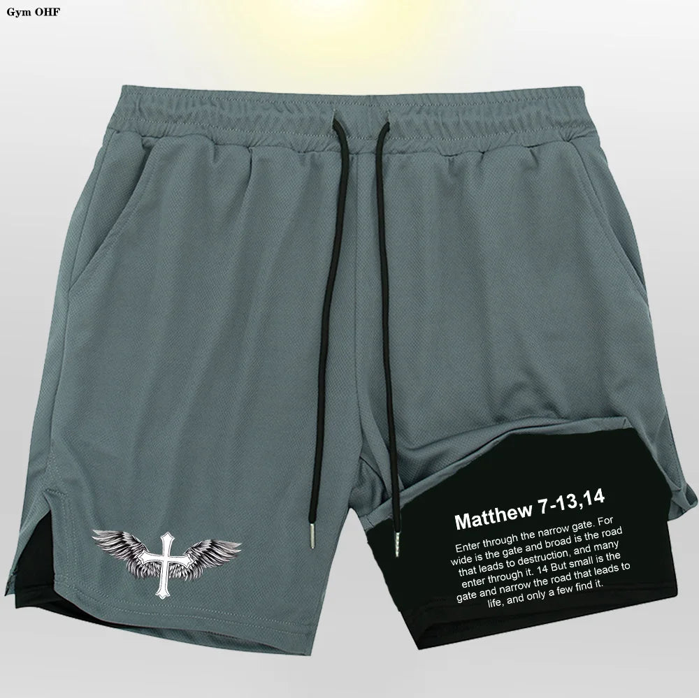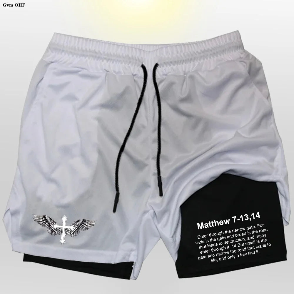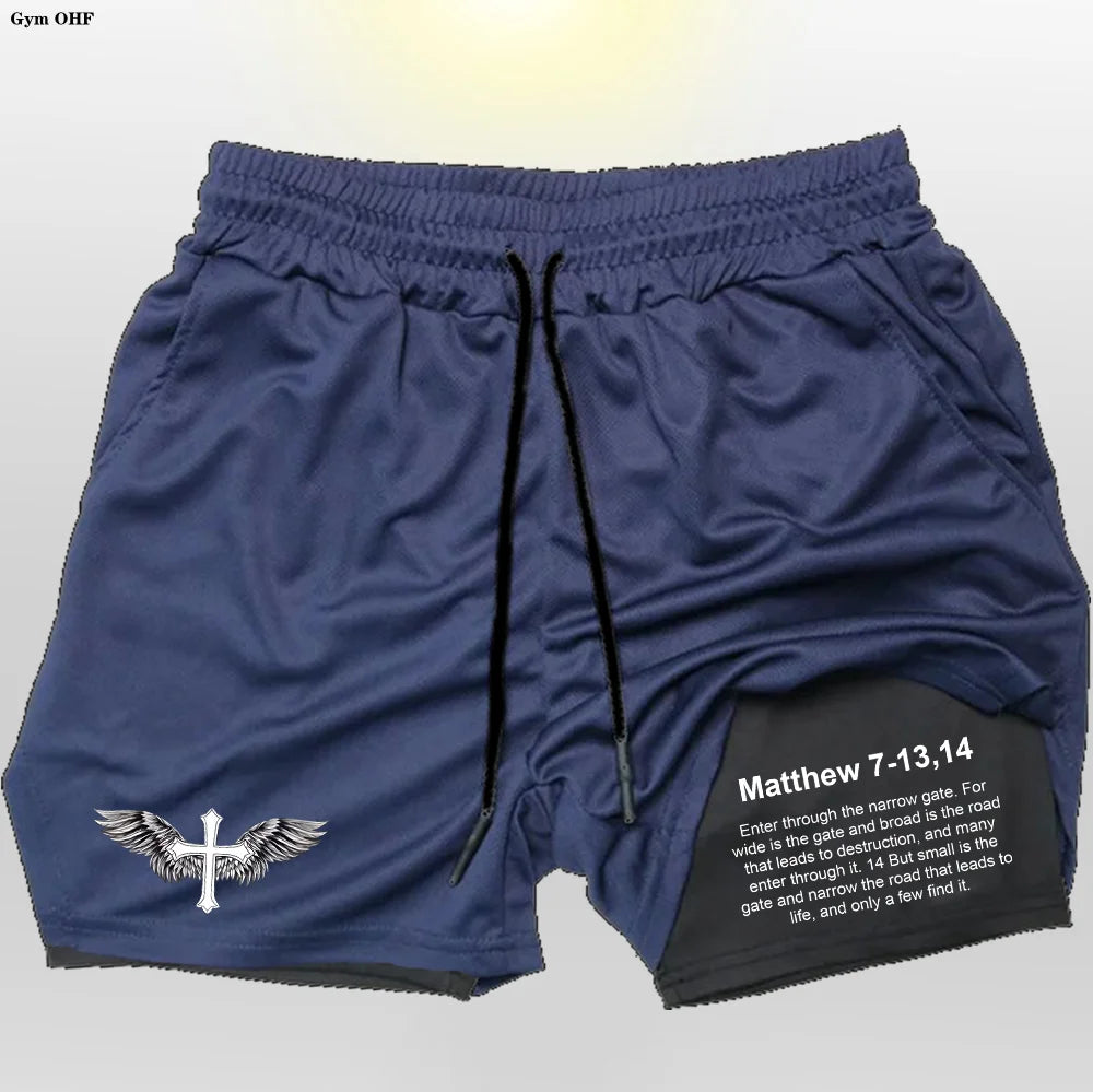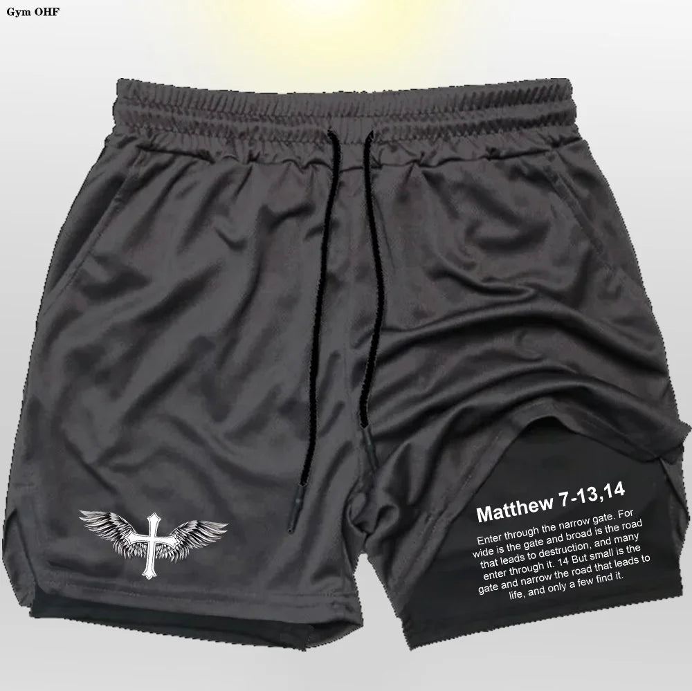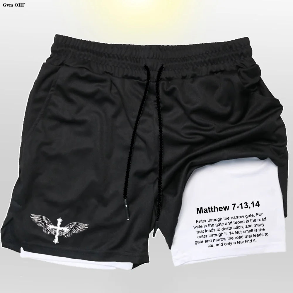 Modern Athletic Style: Featuring a sleek black outer layer contrasted by a clean inner liner with a bold cross graphic and motivational Matthew 7-13,14 verse, these shorts fuse faith and fitness with unapologetic confidence.