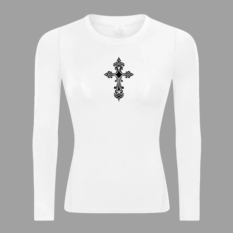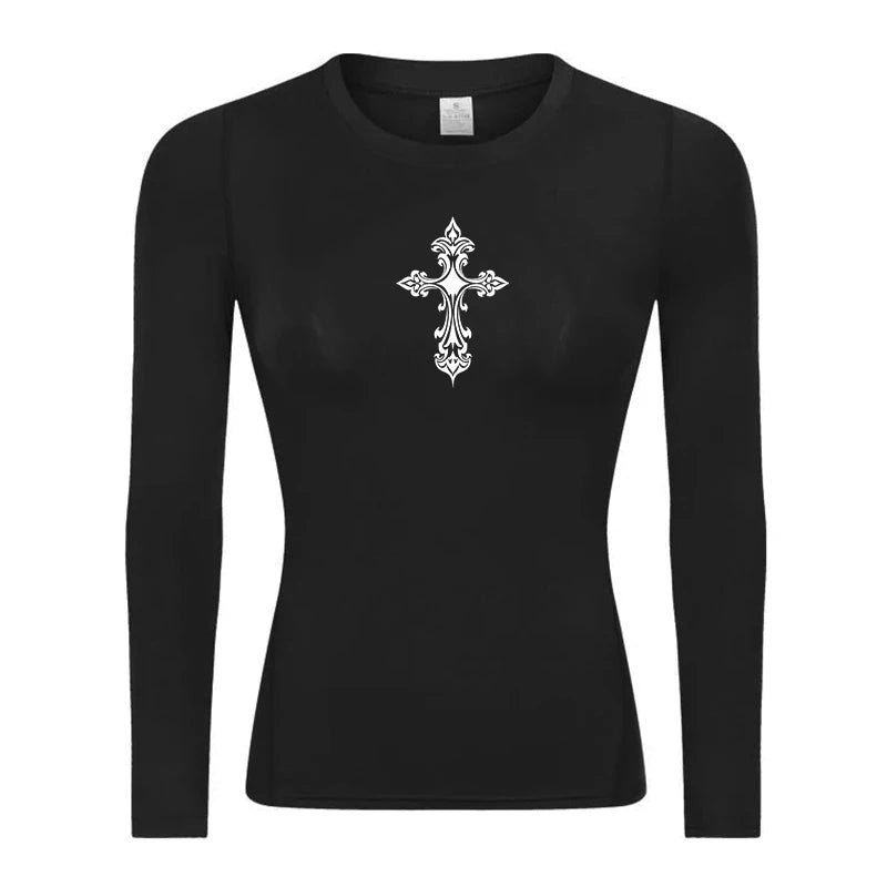Long Sleeve Woman's Revena™ "Fleur-de-lis Cross" Pattern Elastic Compression Shirt