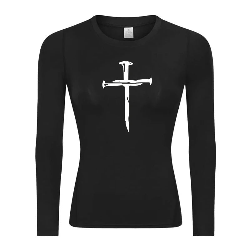 Whether you're pushing your limits in the gym, hitting the trails, or simply looking for a performance-enhancing base layer, the Long Sleeve Woman's Revena™ "Nail Cross" Pattern Elastic Compression Shirt has you covered.